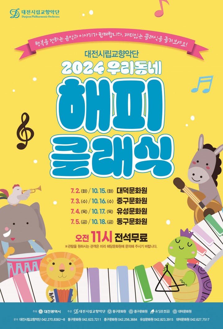 [대전타임뉴스=홍대인 기자] 대전시립교향악단의‘우리동네 해피클래식’연주회가 7월 2일(화)대덕문화원, 3일(수) 중구문화원, 4일(목) 유성문화원, 5일(금) 동구문화원에서 펼쳐진다.음악과 이야기가 함께하는‘해피클래식’은 재미있는 클래식을 집 근처 가까운 공연장에서 볼 수 있는 기회를 제공하는 공연이다.올해도 각 구 문화원과 공동으로 7월과 10월 모두 8차례 공연을 진행하며, 어린이들과 주민들을 대상으로 쉽고 편하게 문화생활을 누릴 수 있도록 문화원으로 직접 찾아가 클래식 음악을 통해 행복한 시간을 전달할 예정이다.공연에서 연주되는 생상의‘동물의 사육제’는 사자, 거북이, 코끼리 등 각종 동물의 특징을 음악으로 표현해 상상력을 자극하고 즐거움과 재미를 선사할 예정이다.또한 클라리넷, 플루트 수석 연주자들의 뛰어난 연주력으로‘왕벌의 비행’등 솔로곡도 감상할 수 있다. 모두가 함께할 수 있는 동요 모음곡은 실로폰으로 연주되며 관객들에게 추억과 동심을 전할 것이다.올해 12년째로 접어든 우리동네 해피클래식은 평소 클래식은 어렵다는 고정관념을 허물고, 지역에 직접 찾아가 주민들에게 고품격 연주를 선사하며 큰 호응을 받아왔다.시민 누구나 무료로 관람이 가능한‘우리동네 해피클래식’은 공연 중간마다 전문 해설자가 프로그램을 이해하기 쉽도록 설명하여 한결 편안하게 즐길 수 있다.대전시립교향악단의 앙상블과 함께 클래식의 매력을 가까이서 느낄 수 있는 소중한 시간으로 기억되길 바란다.연주회 관련 문의 사항은 가까운 문화원 또는 대전시립교향악단 홈페이지(www.dpo.or.kr)를 참조하거나 전화(☎042-270-8382~8)로 문의하면 된다.