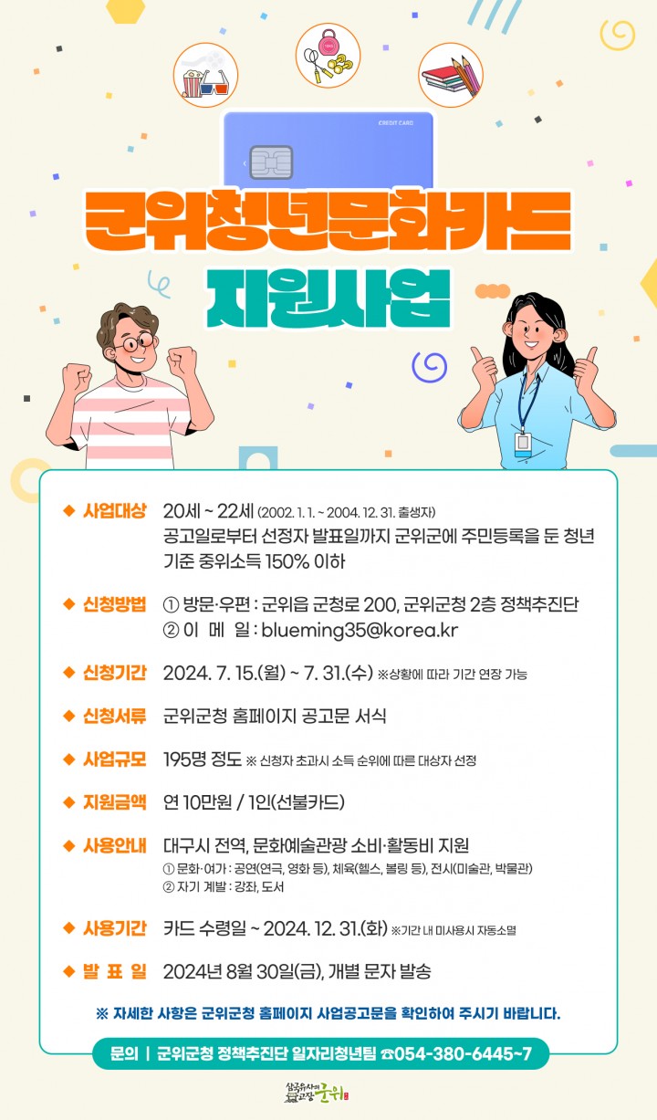[군위타임뉴스] 이승근기자 = 군위군은 지역내 거주 청년들의 문화생활 향유 및 자기계발 기회를 제공하고 청년들의 문화 여가생활 만족도를 높이기 위해 2024년 청년문화카드 지원사업을 추진한다고 밝혔다.신청대상은 공고일로부터 대상자 발표일까지 군위군에 주민등록을 둔 20세~22세(2002년생~2024년생) 청년으로 중위소득 150%이하인 자로써 지원금액은 1인당 연 10만원이며 지급방법은 선불카드로 지급할 계획이다.