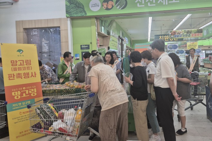 5일 하나로마트 성남점에서는 망고링을 생산한 영주플럼코트발전연구회와 영주시농협조합공동사업법인 등이 참여한 가운데 망고링 브랜드 홍보와 시식행사를 진행하며 망고링의 맛과 향을 알렸다.