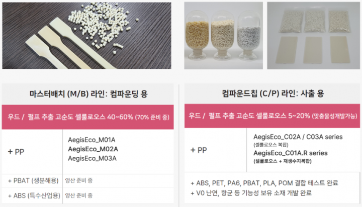 ③ 이지스네이처가 개발한 신소재 제품들은 FSC산림관리 인증 비식용계 목재 및 재생펄프에서 추출한 고순도 마이크로 셀룰로오스와 범용/생분해/재생 플라스틱 수지를 복합한 탄소저감형 바이오 플라스틱 소재로 광범위한 산업 제품에 적용이 가능하다.