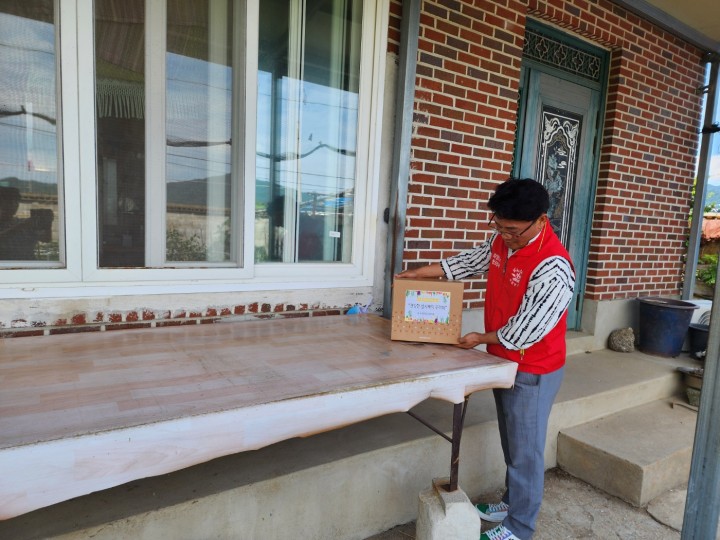 ▲‘조성면 어르신 지킴이단’이 대상 가정에 위문품을 전달하고 있다.(사진제공=보성군)