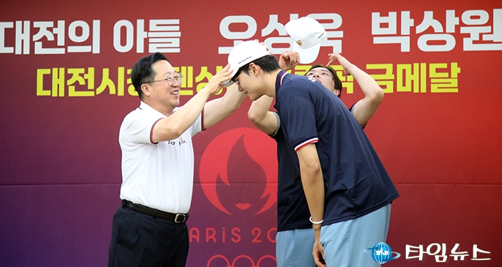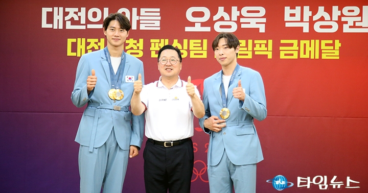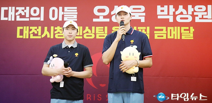 [대전타임뉴스=홍대인 기자] 파리올림픽 펜싱 금메달리스트 오상욱, 박상원 선수가 성심당의 명성을 뛰어넘겠다는 당찬 포부를 밝혔다. 오상욱, 박상원 선수는 8일 국가대표 단복을 입고 대전시청을 방문해 시청 직원들과 인사를 나누고 인터뷰를 가졌다. 오상욱 선수는 “대전은 제가 살아온 환경이고 제가 살아온 보금자리라고 생각한다"며 “대전에서 제 이름을 알릴 수 있게 돼 너무 영광이고 성심당을 뛰어넘는 오상욱이 되겠다"고 소감을 밝혔다.