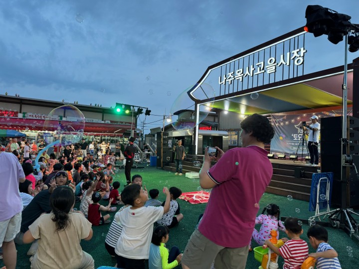 여름 휴가철을 맞아 진행한 이번 행사는 시원한 물놀이와 버블공연, EDM 공연 및 경품행사 등 무더위를 날려버릴 다양한 프로그램으로 구성돼 시장 방문객들에게 시원함과 즐거움을 선사했다.또한 시장 광장에는 ‘너랑 나랑 밤소풍’ 사업의 일환으로 지난 6월부터 매주 토요일 열리고 있는 바비큐존·피크닉존도 마련돼 캠핑 분위기를 즐기려는 가족 단위 관광객들로부터 큰 호응을 받았다.특히 이날은 시장 뒤편에 플리마켓이 추가로 운영되면서 시민과 상인이 하나돼 행사를 즐기는 광경이 연출됐다.윤병태 나주시장은 “나주 시민과 관광객들에게 먹거리, 볼거리, 즐길거리가 가득한 콘텐츠를 제공하는 등 전통시장 활성화에 최선을 다하고 있는 만큼 앞으로도 많은 이용 바란다"고 당부했다.