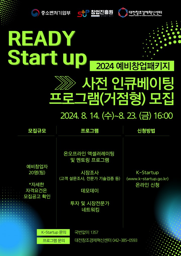 [대전타임뉴스=홍대인 기자] 대전창조경제혁신센터(센터장 박대희, 이하 대전혁신센터)가 예비창업자들을 위한 ‘사전 인큐베이팅 프로그램(거점형)’ 참여자를 이달 23일까지 모집한다.‘사전 인큐베이팅 프로그램(거점형)’은 잠재력 있는 예비창업자들을 조기에 발굴하고 육성하는 것을 목표로 하며, 참가자들에게 온·오프라인 액셀러레이팅 및 비즈니스 모델·투자 등에 관한 멘토링, 데모데이 등 다양한 지원을 제공할 예정이다.자세한 내용은 K-스타트업 홈페이지(www.k-startup.go.kr) 또는 대전혁신센터 홈페이지(www.dci.or.kr)를 통해 확인 가능하다.박대희 대전혁신센터장은 이번 프로그램에 대한 기대감을 표명하며 “이 프로그램이 예비창업자들이 혁신 성장할 수 있는 발판이 되기를 기대한다"며 “센터가 쌓아온 창업지원 노하우와 인프라를 적극 활용해 성공적으로 예비창업자의 성장을 지원하겠다" 고 밝혔다.