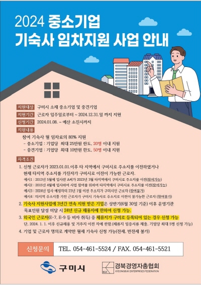 구미시의 임차비 지원 사업은 (사)경북경영자총협회에 위탁하여 시행되며, 중소·중견기업 사업주가 아파트, 빌라, 원룸 등을 임차하여 근로자 기숙사로 제공하는 경우, 월 임차료의 80% 이내, 최대 25만 원까지 1년간 지원된다.