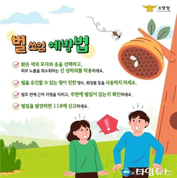 벌쏘임을 예방하기 위해서는 △향수나 화장품과 같은 벌을 자극할 수 있는 제품 사용 자제 △어두운 색상의 옷 보다는 밝은 색상의 옷 착용 △탄산음료 및 달콤한 음료 섭취 자제 등을 권장하고 있다.