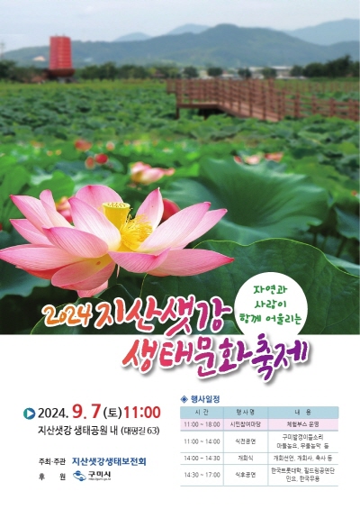 [구미타임뉴스 이승근 기자] 구미시 지산동은 오는 7일, 도심 속 힐링 명소인 지산샛강생태공원에서 ‘2024 지산샛강 생태문화 축제’를 개최한다.