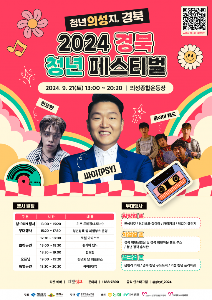 특히 이번 행사에는 경북지역 지자체 행사로는 처음으로 글로벌 스타 싸이(PSY)의 특별공연이 예정되어 있으며 △한요한 △중식이밴드 △로컬 아티스트(디아만테, 돌담 곁에 이끼)의 공연과 청년 워밍업, 청년 치얼업, 청년 벌크업을 주제로 경북 청년정책 소개, 인생네컷 촬영, 청년 플리마켓 등 다양한 부대행사도 계획중이다.
