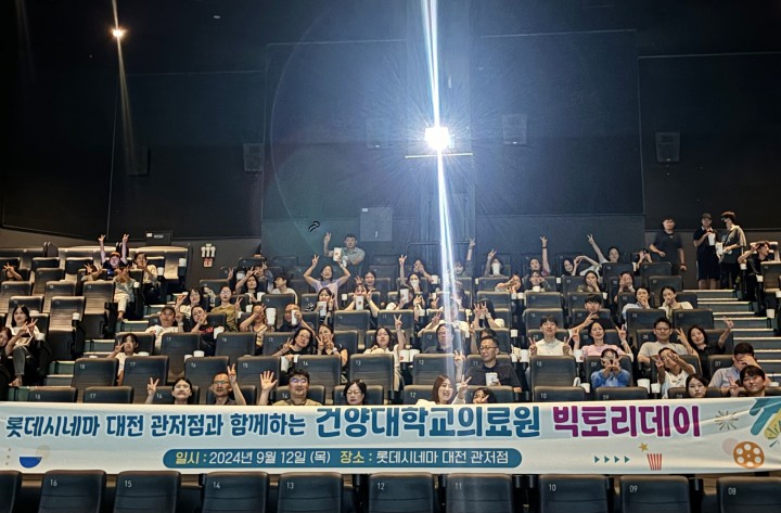[대전타임뉴스=홍대인 기자] 건양대병원(의료원장 배장호)이 12일, 롯데시네마 대전 관저점에서 교직원 단체 영화관람 이벤트인 ‘빅토리 데이’ 행사를 개최했다. 교직원들에게 활력을 불어넣고 구성원간 화합과 병원 발전을 기원하기 위해 마련된 이번 행사에는 추첨을 통해 선정된 240여 명의 교직원이 참여했다. 교직원들은 화합과 단합으로 병원 발전과 고객만족 증진에 앞장설 것을 다짐하고 영화 ‘빅토리’를 함께 관람했으며, 병원은 관람료와 팝콘 등 간식을 함께 제공했다. 배장호 의료원장은 “추석 연휴에도 국민들이 안전하고 행복한 명절을 보낼 수 있도록 24시간 응급진료체계를 잘 유지해주실 것을 당부드린다"며, “앞으로도 구성원간 소통과 신뢰를 바탕으로 더 큰 발전을 이루도록 함께 노력하자"고 말했다. 한편 이번 빅토리 데이 이벤트는 롯데시네마 대전 관저점에서 의료진을 위한 무료영화 상영으로 진행됐다.