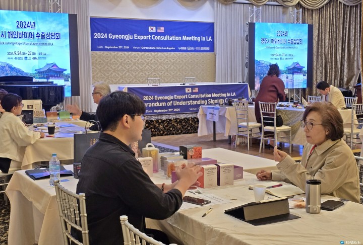 [경주타임뉴스=전찬익기자] 경주시가 미국 현지에서 수출상담회를 열어 식품제조기업 5곳과 미화 111만 달러 규모의 수출협약(MOU)를 체결하는 성과를 올렸다고 2일 밝혔다.시에 따르면 지난달 25일 미국 LA 한인타운 가든스위트호텔에서 열린 ‘2024 경주시 해외바이어 수출상담회’에 경주지역 식품제조기업 10곳이 참가해 LA지역 30곳의 바이어와 수출 상담을 진행했다.미국은 한국의 최대 수출 대상국으로 이 가운데 LA는 한인 약 33만명이 거주하는 한인 비중이 높은 도시다.이번 수출상담회를 통해 미국 내 한인사회는 물론 미국 전역에 한국산 프리미엄 농수산물을 판매하는 울타리USA와 향후 5년 동안 500만 달러 규모의 수출을 위한 상호협력 합의각서(MOA)도 체결했다.앞서 경주시는 2022년 태국·말레이시아, 2023년 싱가포르에 이어 이번 세 번째 해외 수출상담회를 통해 역대 가장 높은 성과를 냄으로써 지속적인 성장과 성공을 이어가고 있다.주낙영 경주시장은 “이번 상담회가 경주시의 우수한 상품과 기술을 북미에 알리는 좋은 기회가 되길 바란다"며 “앞으로도 지속적인 지원과 다양한 프로그램을 마련하여 수출 기업들의 해외 진출을 적극 돕겠다"고 말했다.