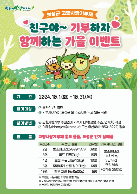 [보성타임뉴스] 오현미 기자 = 전남 보성군은 가을을 맞아 오는 31일까지 고향사랑기부제 활성화를 위한 ‘친구야~ 기부하자 함께하는 가을 이벤트’를 추진한다고 밝혔다. 이번 이벤트는 10월 한 달간 보성군 고향사랑기부제 지인 추천을 한 추천인과 추천을 받은 기부자에게 인기 답례품과 소정의 홍보 물품이 선착순으로 증정된다. 더 많은 추천을 한 경우일수록 경품은 더 다양해지며, 주요 경품은 2명인 경우 보조배터리 5000mAh(선착순 30명), 3명인 경우 골드키위 3kg(선착순 15명), 4명인 경우 보성 녹돈 세트 1.2kg(선착순 10명), 5명인 경우 무항생제 손질 장어 1kg(선착순 10명), 10명인 경우 한우 채끝 등심 600g(선착순 5명)이다. 추천을 받아 기부한 지인 경품으로는 보조배터리, 녹차 비누, 3단 우산 중 1개 품목이 임의로 발송된다. 단, 1명당 10만 원 이상 기부를 해야 추천인으로 인정이 되고 고액 기부자 추천 시 10만 원당 추천인 1명으로 인정된다. 예를 들어 100만 원의 고액 기부자 추천 시 추천인 10명으로 집계된다. 또한, 선착순 접수로 이벤트 참가가 인정되며, 경품 중복 지급은 불가능하다. 경품은 이벤트 기간이 끝난 후 오는 11월 8일까지 선착순 접수자에게 순차적으로 발송된다. 보성군 관계자는 “이번 이벤트를 통해 함께하는 기부 문화가 정착돼 보성군 고향사랑기부제가 크게 활성화될 수 있는 계기가 되길 바란다"고 전했다