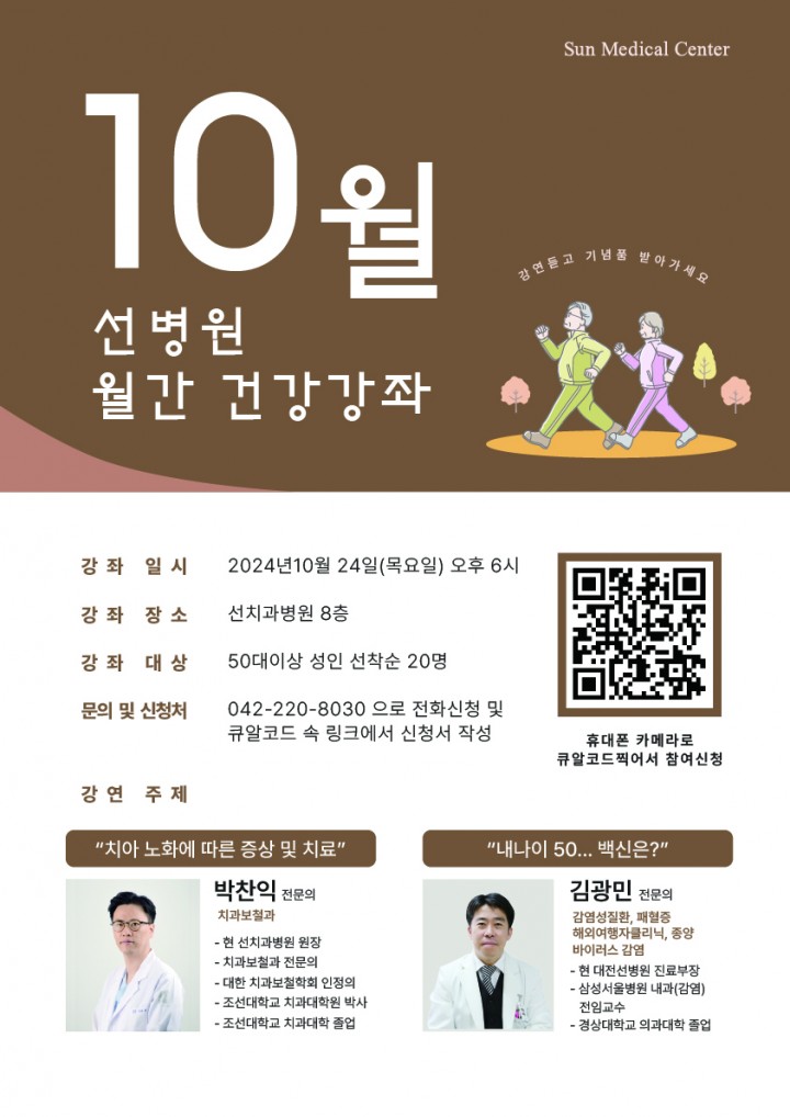 이번 행사는 △치아 노화에 따른 증상 및 치료(치과보철과 박찬익 전문의), △내 나이 50.. 백신은?(감염내과 김광민 전문의) 로 각각 30분씩(질의 10분 강연 20분) 2개 강연으로 선치과병원 8층에서 진행 될 예정이다.