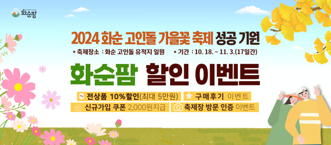 화순군 관계자는 "화순 고인돌 가을꽃 축제 성공을 기원하기 위해 화순팜에서 다양한 이벤트를 준비했다"며 "축제장에서도 화순팜 농가들의 우수한 상품을 직접 구매할 수 있으니 많은 관심 바란다"고 말했다.