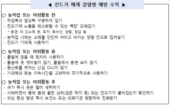 또한, 야외 활동 후 2주 이내에 발열 등의 증상이 나타나면 조기 진단과 치료를 위해 즉시 의료기관을 방문하는 것이 필요하다.