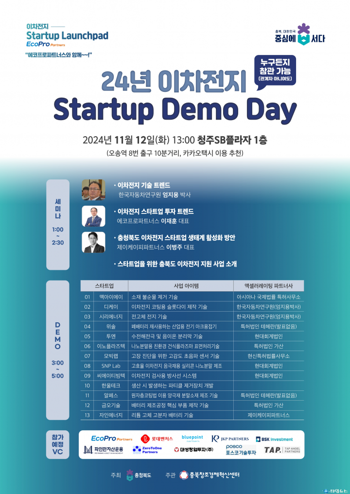 충북도, 이차전지 스타트업 발굴·육성을 위한 ‘이차전지 데모데이’ 개최