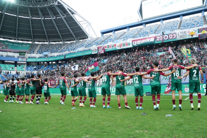 [대전타임뉴스=홍대인 기자] 잔류를 확정한 대전하나시티즌은 최종전 승리를 통해 홈 팬들에게 마지막 선물을 주려고 한다.대전하나시티즌은 24일 오후 2시 대전월드컵경기장에서 열리는 ‘하나은행 K리그1 2024’ 38라운드(파이널B 5라운드)에서 제주 유나이티드와 대결한다. 대전은 승점 45점(11승 12무 14패, 41득점 46실점, -5)을 얻어 9위에 올라있다.대전은 잔류를 확정한 상태다. 파이널 라운드를 앞두고 연패를 한 대전은 남해 미니 전지훈련을 통해 조직력을 다졌다. 황선홍 감독을 중심으로 분위기를 만들었고 그 결과 파이널 라운드에서 무패로 잔류에 성공했다. 전북 현대를 2-0으로 잡더니 대구FC를 1-0으로 격파했다. 광주FC와 0-0 무승부 인천 유나이티드에 2-1로 이겨 최소 9위를 확정해 잔류하게 됐다. 황선홍 감독은 인천전 승리 이후 “어려운 경기가 될 거라고 예상했다. 선수들에게 감사하다. 멀리까지 응원해 주신 팬분들 덕분에 잔류할 수 있었다고 생각한다. 이제 시작이다. 더 높은 곳을 향해 나아가야 한다"고 소감을 밝혔다. 또 황선홍 감독은 “포기하지 않아야 한다고 생각한다. 힘들다고 멈추면 거기가 끝이다. 인생은 도전의 연속이다. 우리 팬들에게 납득할 수 있는 팀이 만들어져야 한다. 갈 길이 멀다. 내 스스로 놓지 않는 것이, 도전하는 모습이 황선홍의 모습이라고 생각한다"라고 말하기도 했다. 목표를 이룬 대전은 홈 승리로2024시즌을 마무리하려고 한다. 2024시즌 대전은 다사다난했다. 시즌 초반 부진 속 감독이 바꾸었고 중반이 넘어서까지 강등권을 유지해 팬들은 전전긍긍했다. 대전 팬들의 응원과 함께 반등해 잔류까지 했기에 마지막 홈 경기에서 승리를 선물하며 팬들의 성원에 보답할 생각이다. 상대 제주도 잔류를 확정한 상태다. 대전은 올 시즌 제주를 상대로 승리가 없다. 3연패를 당하면서 제주에 유독 고전했다. 제주만 만나면 고개를 숙였던 대전은 홈 팬들 성원 속 이번엔 승리를 해 마지막에 누구보다 활짝 웃으려고 한다. 제주를 잡으면 동시간대 열리는 광주FC와 전북 대결 결과에 따라 8위에 오를 수 있다. 대전에 또 다른 동기부여다.