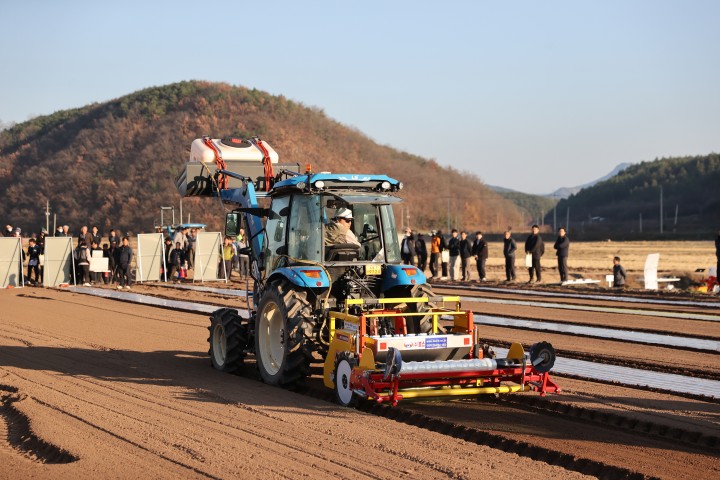 이번 연시회는 자율주행 키트를 부착한 트랙터를 활용해 마늘 파종, 제초제 살포, 비닐피복 등의 작업을 한 번에 시연하는 방식으로 진행됐다.