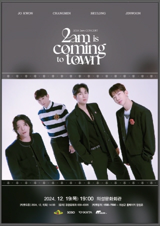 [의성타임뉴스 이승근 기자] 의성군은 오는 12월 19일 저녁 7시 의성문화회관에서 보컬 그룹 2am의 콘서트 *‘2024 2am concert: 2am is coming to town’*을 군 단위 최초로 개최한다고 밝혔다.