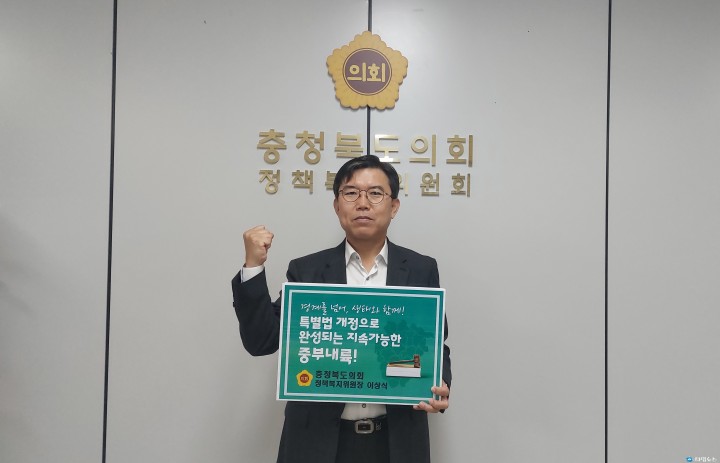 [충북타임뉴스=한정순 기자] 충북도의회 정책복지위원회 이상식 위원장(청주9)은 27일 ‘중부내륙연계발전지역 지원에 관한 특별법(중부내륙특별법)’ 개정을 위한 릴레이 챌린지에 참여했다. 이 위원장은 ‘경계를 넘어, 생태와 함께! 특별법 개정으로 완성되는 지속가능한 중부내륙’이라는 슬로건을 들고 특별법 개정의 필요성을 강조하며, “충북뿐 아니라 중부내륙지역의 상생발전을 위해 반드시 특별법 개정이 필요하다"고 했다. 이어 “정책복지위원회 위원들, 집행기관, 지역 국회의원과 함께 협력해 특별법 개정을 반드시 이뤄내겠다"고 덧붙였다. 이번 릴레이 챌린지는 중부내륙특별법 개정에 대한 공감대를 확산하기 위해 마련됐으며, 충청북도의회 의원들과 도내 11개 시·군, 15개 충북도 출연기관이 참여하고 있다.