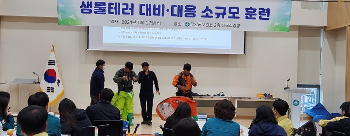 [무안타임뉴스] 오현미 기자 = 전남 무안군은 지난 27일 보건소 다목적 강당에서 보건소 직원과 소방, 경찰, 공항검역소 직원 등 100여 명이 참여한 가운데 생물테러 대비 초동 대응 교육 및 소규모 훈련을 실시했다.생물테러는 바이러스, 세균, 독소 등을 이용해 특정 대상이나 일반 대중에게 살포하는 행위이다. 이는 대량의 인명피해가 발생할 수 있고 빠른 전파 속도와 소량으로도 높은 치사율을 가지기 때문에 초기 대응이 매우 중요하다.이번 훈련에서는 생물테러에 대한 초기 대응 교육, 다중탐지키트 및 검체 수송용기 포장 교육, 개인보호복(레벨 A, C) 착‧탈의 실습 등 체험형 훈련으로 진행됐다.김성철 보건소장은 “훈련을 통해 생물테러 초동대응요원의 현장대응 능력을 향상하고 관계기관과의 협력체계를 강화하는 계기가 됐다"며 “앞으로도 시민의 생명을 보호하고 안전을 도모할 수 있는 신속한 대응체계 구축에 최선을 다하겠다"고 말했다.