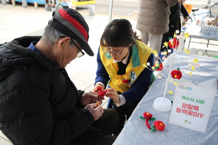 ▲지난 6일 전남 여수시 이순신 광장에서 한 시민이 양말목을 재활용해 여수시의 시화인 오동도 동백꽃 브로치를 만들고 있는 모습.(사진제공=신천지자원봉사단 여수지부)
