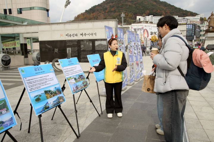 ▲지난 6일 ‘2026여수세계섬박람회’ 홍보 활동 캠페인이 열리는 이순신광장에서 섬 소개 설명을 듣고 있는 시민의 모습.(사진제공=신천지자원봉사단 여수지부)
