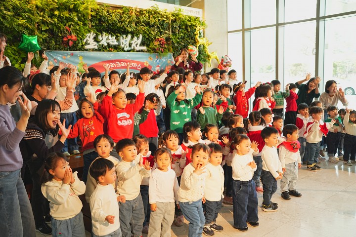 [대전타임뉴스=홍대인 기자] “루돌프 사슴코는 매우 반짝이는 코 만일 네가 봤다면 불붙는다 했겠지" 꼬마 천사들의 목소리가 건양대병원 로비를 가득 메웠다. 건양대병원 직장어린이집(원장 조민희) 원아들이 12일, 건양대병원 신관 로비에서 ‘환우를 위한 힐링음악회’를 개최했다. 이번 행사는 연말을 맞아 환우와 교직원들을 응원하기 위해 마련됐다. 3세부터 7세까지 총 96명의 원아들은 음악에 맞춰 합창과 율동 공연을 선보였다. 프로그램은 ▲윤빛반(3세)의 겨울바람, 행복송 ▲단빛반(3세)의 멋진 눈사람, 울면 안돼 ▲물빛반(4세)의 흰 눈 사이로, 러브송 ▲쪽빛반(5세)의 루돌프 사슴코, 캔디 ▲은빛1반(6세)의 크리스마스에는 축복을, 사랑스러워 ▲은빛2반(6세)의 창밖을 보라, 써니 ▲현빛반(7세)의 고민중독, 마법의 성 등의 순으로 진행됐다. 투병생활에 지친 환우들과 의정갈등 상황으로 피로가 누적된 교직원들의 입가에 모처럼 미소가 번졌다. 건양어린이집 조민희 원장은 “오늘 무대를 위해 열심히 노력해준 아이들과 선생님들에게 감사의 인사를 전하며, 아이들이 정성껏 준비한 음악회가 환우들에게 따뜻한 감동으로 전해졌기를 바란다"고 말했다.