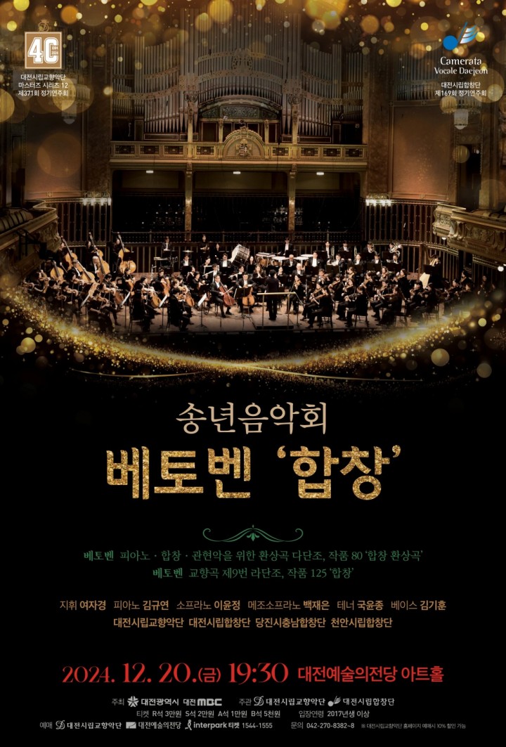 [대전타임뉴스=홍대인 기자] 대전시립교향악단은 오는 20일(금) 저녁 7시 30분, 대전예술의전당 아트홀에서 마스터즈 시리즈12와 대전시립합창단 제169회 정기연주회 송년음악회 ‘베토벤 합창’을 선보인다. 이번 무대는 대전시립교향악단 예술감독 겸 상임지휘자인 여자경의 지휘 아래 피아노 김규연, 소프라노 이윤정, 메조소프라노 백재은, 테너 국윤종, 베이스 김기훈과 함께 대전시립합창단, 당진시충남합창단, 천안시립합창단이 베토벤의 명작을 연주할 예정이다. 연주회의 첫 번째 프로그램은 베토벤의 ‘합창 환상곡’으로, 이 작품은 피아노 독주곡, 협주곡, 합창곡이 한 곡으로 결합된 독특한 구성을 자랑한다. 베토벤의 개성과 독창성이 돋보이는 이 곡은 피아니스트 김규연의 협연과 대전시립합창단, 당진시충남합창단, 천안시립합창단의 풍성한 합창이 어우러져 깊은 감동을 선사할 예정이다. 이어지는 프로그램은 ‘합창 교향곡’으로 잘 알려진 베토벤의 ‘교향곡 제9번 라단조, 작품 125’이다. 이 곡은 베토벤이 작곡한 마지막 교향곡으로, 그의 청력이 완전히 상실된 상태에서 완성된 작품이다. 특히 프리드리히 실러의 ‘환희의 송가’를 가사로 사용한 4악장은 인류 화합과 평화의 메시지를 담아내고 있다. 이번 연주는 소프라노 이윤정, 메조소프라노 백재은, 테너 국윤종, 베이스 김기훈과 대전시립합창단, 당진시충남합창단, 천안시립합창단이 함께해 화려하고 웅장한 대미를 장식할 예정이다. 연주회 예매는 공연 전일 오후 5시까지 대전시립교향악단 홈페이지, 대전예술의전당 홈페이지, 그리고 인터파크에서 가능하다. 보다 자세한 정보는 대전시립교향악단 홈페이지를 참조하거나 전화(042-270-8382~8)로 문의하면 된다.