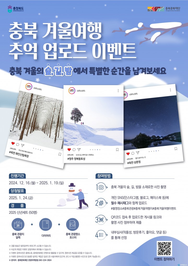 [충북타임뉴스=한정순 기자] 충북문화재단이 본격적인 겨울을 맞아 충북 겨울 관광 홍보 이벤트를 16일부터 다음 달 19일까지 진행한다고 밝혔다. 이번 이벤트는 여름과 가을에 이어 충북의 아름다운 겨울 관광지의 매력을 널리 알리고 지역 관광 활성화를 도모하고자 ‘충북 겨울-여행 추억 업로드’라는 주제로 마련됐다. 참여 방법은 간단하다. 누구나 충북의 겨울-숲, 겨울-길, 겨울-밤을 소재로 직접 촬영한 사진을 개인 SNS(인스타그램, 블로그, 페이스북)에 지정 해시태그와 함께 게시하고, 제공된 QR코드를 통해 게시물 링크를 제출하면 된다. 재단은 심사를 통해 참여자 50명을 선정해 2025년 충북 관광지 탁상달력, 다이어리, 충북 겨울 관광명소 포스터로 구성된 **‘2025년 신년세트’**를 기념품으로 제공할 예정이다. 충북문화재단 관계자는 “이번 이벤트를 통해 겨울철 충북의 아름다운 관광지를 널리 알리고, 관광 홍보 콘텐츠를 확보하는 계기가 되길 기대한다"며 “많은 분들이 충북의 매력을 발견하고 참여해 주시길 바란다"고 전했다. 이벤트에 대한 자세한 내용은 충북문화재단 홈페이지(https://www.cbfc.or.kr/)와 재단 SNS(인스타그램, 블로그 등) 채널에서 확인할 수 있다.