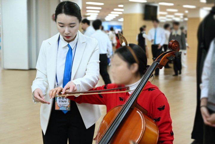 ▲지난 8일 피터 하늘 문화 아카데미 박람회에서 학생이 스탭의 도움 받아 첼로를 배우고 있는 모습.(사진제공=신천지 광주교회)