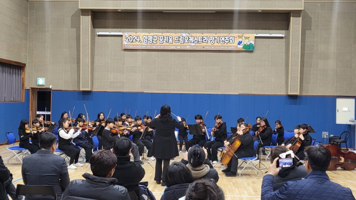 [함평타임뉴스] 오현미 기자 = 전남 함평군은 최근 기산초등학교 강당에서 꿈키움 드림오케스트라 단원들과 가족 등 130여 명이 참석한 가운데 정기연주회를 개최했다고 밝혔다.꿈키움 드림오케스트라 단원들은 초등학교부터 중학교의 학생들로 최영미 지휘자의 지휘하에 바이올린, 비올라, 첼로 현악 3중주의 아름답고 조화로운 소리를 통해 그동안의 성과를 선보였다.이날 연주회는 1년 동안의 노력과 열정을 담아 40여 명의 단원들이 고향의 봄, 신세계로부터, 환희의 송가 등 총 8곡을 연주했다.