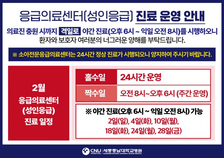 [세종타임뉴스=홍대인 기자] 세종특별자치시(시장 최민호)는 세종충남대학교병원 성인 응급실이 지난 1월에 이어 2월에도 홀수일에만 24시간 운영된다고 2일 밝혔다. 세종충남대병원은 응급의료 전담 의사 인력 부족으로 인해 지난 1월부터 홀수일에만 24시간 진료를 진행하고, 짝수일에는 주간에만 응급실을 운영해왔다. 2월에도 동일한 방식으로 운영될 예정이며, 짝수일에는 응급실 운영 시간이 날짜별로 달라 시민들이 사전에 운영 시간을 확인할 필요가 있다. 짝수일 중 6일, 8일, 12일, 14일, 16일, 20일, 22일, 26일에는 응급실이 주간에만 운영되어 오후 6시부터 다음 날 오전 8시까지 야간 진료가 제한된다. 반면, 2일, 4일, 10일, 18일, 24일, 28일 등 나머지 짝수일과 소아 전문 응급의료센터는 24시간 정상 운영된다. 이영옥 보건복지국장은 "이번 달에도 세종충남대병원 응급실의 야간 진료가 제한되는 날이 있으니 시민 여러분께서 진료에 차질이 없도록 미리 확인해 주시길 바란다"며 "가벼운 호흡기 증상과 같은 비교적 경미한 증상이 있는 환자들은 가까운 동네 의원을 이용해 주시기를 당부드린다"고 말했다. 한편, 지역 응급의료기관인 엔케이세종병원 응급실은 24시간 정상 운영되고, 달빛어린이병원은 평일 오후 11시까지, 주말과 공휴일에는 오후 9시까지 운영된다. 관내 문을 연 병의원 정보는 응급의료포털(www.e-gen.or.kr) 또는 응급의료포털 앱에서 확인할 수 있다.