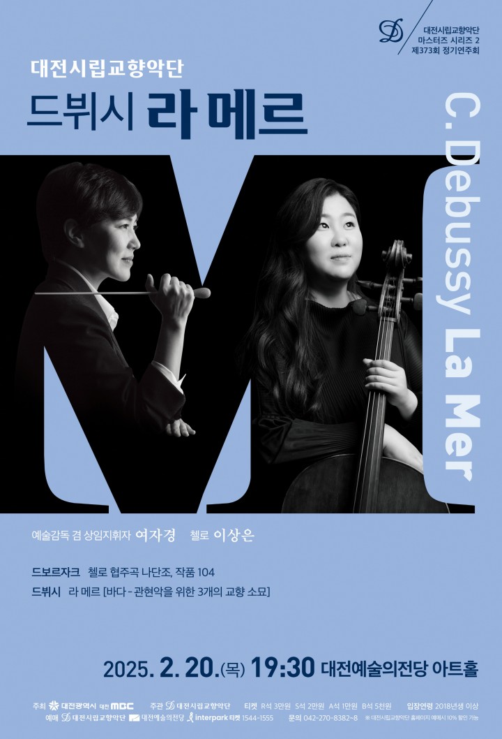 [대전타임뉴스=홍대인 기자] 대전시립교향악단은 오는 20일(목) 오후 7시 30분, 대전예술의전당 아트홀에서 2025년 두 번째 마스터즈 시리즈 ‘드뷔시 라 메르’를 선보인다. 국내외 최정상급 지휘자와 협연자들이 함께하는 대전시향의 마스터즈 시리즈, 올해 두 번째 무대에서는 예술감독 여자경의 지휘와 첼리스트 이상은의 협연으로 더욱 깊이 있는 음악을 선사할 예정이다. 공연의 첫 순서는 ‘첼로 협주곡의 제왕’으로 불리는 드보르자크 첼로 협주곡 나단조이다. 서정적인 선율과 웅장한 오케스트레이션이 돋보이는 이 작품은 세계적인 무대에서 활약 중인 첼리스트 이상은과의 협연으로 더욱 빛을 발할 것으로 기대된다. 이상은은 한국예술종합학교와 미국 커티스 음악원을 졸업한 후, 윤이상 국제콩쿠르 및 요한슨 국제콩쿠르 1위, 중앙 콩쿠르 1위 등 국내외 유수의 콩쿠르에서 두각을 나타내며 세계적인 음악가로 자리매김하고 있다. 이어지는 후반부에서는 드뷔시의 대표작 중 하나인 라 메르 ‘바다-관현악을 위한 3개의 교향 소묘’가 연주된다. 이 작품은 일본인 화가 가쓰시카 호쿠사이의 그림 ‘가나가와의 파도’에서 영감을 받아 작곡된 곡으로, 바다의 다양한 표정을 생생하게 담아낸다. 파도와 바람, 햇빛이 어우러지는 환상적인 바다의 세계를 웅장한 오케스트라 사운드로 경험할 수 있는 기회가 될 것이다. 예매는 공연 전일 오후 5시까지 대전시립교향악단 홈페이지, 대전예술의전당 홈페이지, 인터파크에서 가능하다. 자세한 사항은 대전시립교향악단 홈페이지에서 확인하거나 궁금한 사항은 대전시 문화예술과(☎042-270-8382~8)로 문의하면 된다.