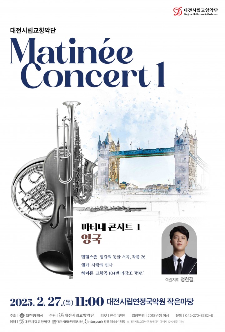 [대전타임뉴스=홍대인 기자] 대전시립교향악단이 오는 27일(목) 오전 11시 대전시립연정국악원 작은마당에서 올해 첫 ‘마티네 콘서트’를 개최한다. 마티네 콘서트는 클래식 애호가들에게 친숙한 기획 시리즈로, 지휘자의 해설과 함께 수준 높은 연주를 선보이며 꾸준한 인기를 끌고 있다. 올해 마티네 콘서트는 ‘나라’를 주제로 구성되며, 첫 공연에서는 ‘영국’의 대표 클래식 음악을 선보인다. 이번 무대는 인천시립교향악단 부지휘자인 정한결이 지휘봉을 잡고, 영국과 관련된 명곡들을 연주한다. 공연은 멘델스존의 ‘핑갈의 동굴’ 서곡으로 시작된다. 스코틀랜드 해안의 자연경관에서 영감을 얻어 작곡된 이 곡은 웅장한 분위기로 관객들에게 감동을 선사할 예정이다. 이어 엘가의 대표적 서정곡 ‘사랑의 인사’가 연주되며, 마지막으로 하이든의 교향곡 제104번 ‘런던’이 무대를 장식한다. 이 곡은 하이든이 런던에서의 성공을 바탕으로 작곡한 명작으로, 그의 교향곡 중 정점으로 평가받는다. 정한결 지휘자는 이번 연주에서 곡의 배경과 특징을 친절히 설명하며, 관객들에게 더욱 깊이 있는 음악적 감동을 선사할 계획이다. 공연 예매는 전날 오후 5시까지 대전시립교향악단 홈페이지, 대전시립연정국악원 작은마당, 인터파크에서 가능하며, 자세한 사항은 대전시립교향악단 홈페이지 또는 전화(☎042-270-8382~8)로 문의하면 된다.