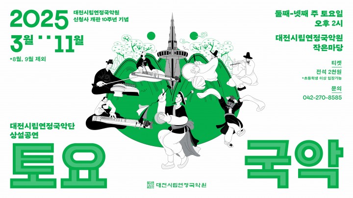 [대전타임뉴스=홍대인 기자] 대전시립연정국악단의 대표 공연인 ‘토요국악’이 오는 3월부터 11월까지(8월, 9월 제외) 매월 둘째, 넷째 주 토요일 오후 2시, 국악원 작은마당에서 총 14회에 걸쳐 상설공연으로 진행된다. ‘토요국악’은 국악 애호가는 물론 처음 접하는 시민들도 쉽게 즐길 수 있도록 전통과 창작을 아우르는 다채로운 프로그램으로 구성된 주말 인기 공연이다. 악(樂)·가(歌)·무(舞)를 아우르는 다양한 국악 공연을 통해 우리 전통음악의 매력을 전할 예정이다. 매월 둘째 주에는 궁중과 민간에서 연행되던 장엄하고 흥겨운 전통국악 공연이 마련된다. 넷째 주에는 유네스코 인류무형문화유산에 등재된 종목을 비롯해 성악, 무용, 연희 등 다양한 장르의 대표 프로그램을 선보인다. 또한 국악의 대중화를 위한 창작 프로그램을 포함해 국악의 깊이와 다양성을 경험할 수 있도록 기획됐다. ‘토요국악’은 전통문화예술의 가치를 재발견하는 기회를 제공하며, 관객들에게 국악의 다채로운 멋과 매력을 느낄 수 있는 특별한 시간이 될 것이다. 공연 입장료는 전석 2천 원이며, 보다 자세한 사항은 대전시립연정국악원 공식 홈페이지(www.daejeon.go.kr/kmusic) 및 인터파크(ticket.interpark.com)에서 확인할 수 있다. 기타 문의는 대전시립연정국악단(☎042-270-8585)으로 하면 된다.