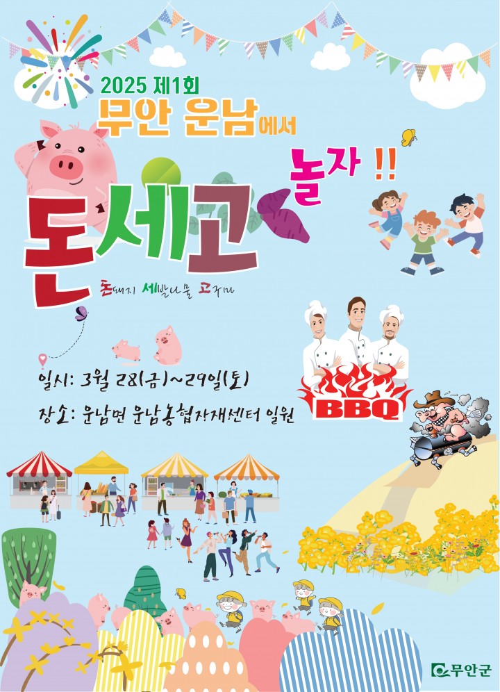 [무안타임뉴스] 오현미 기자 = 전남 무안군은 운남면 소재지 일원(운남농협자재센터)에서 ‘돈‧세‧고 놀자 축제’를 오는 28일부터 29일까지 개최한다고 밝혔다.‘돈세고’는 운남면의 특산물인 돼지(돈), 세발나물(세), 고구마(고)를 뜻하며, 축제를 통해 지역특산물 브랜드가치를 높이고 지역 경제에 활력을 불어넣는 계기를 마련할 예정이다.축제는 제1회 개최를 축하하는 터치버튼 기념식으로 시작되며, 운남 돈세고 가요제, 개막축하공연, 낭만버스킹, 폐막 축하공연 등 다채로운 무대가 펼쳐진다.특히, 운남 돈세고 가요제는 전국에서 모인 참가자들이 열띤 경쟁을 펼치는 가운데 지역 주민과 관광객이 함께 어우러지는 축제의 하이라이트가 될 전망이다.관광객이 직접 참여할 수 있는 복불복 이벤트 등 흥미로운 프로그램도 마련되며, 가족 단위 방문객을 위한 맞춰보자 도개걸윷모, 어린이 돼지낚장 체험(돼지모형 낚시) 등 다양한 체험 행사도 운영된다.더욱이 행사장 인근에는 드넓은 유채꽃밭이 조성돼, 봄의 정취를 만끽하며 인생샷을 남길 수 있는 명소가 될 예정이다.또한, 운남의 맛을 제대로 즐길 수 있도록 돼지와 세발나물 밥상, 초당대 호텔조리학과 특별판매존, 풍차바비큐존, 돈세고 먹거리존 등의 먹거리 부스도 운영된다.김산 무안군수는 “이번 축제는 주민과 농민, 지역 상인이 함께하는 공동체 축제로, 무안군의 대표적인 농촌 관광자원과 특산물을 널리 알리는 기회가 될 것"이라며, “많은 관광객들이 방문해 지역 경제에 활력을 불어넣길 기대한다"고 전했다.
