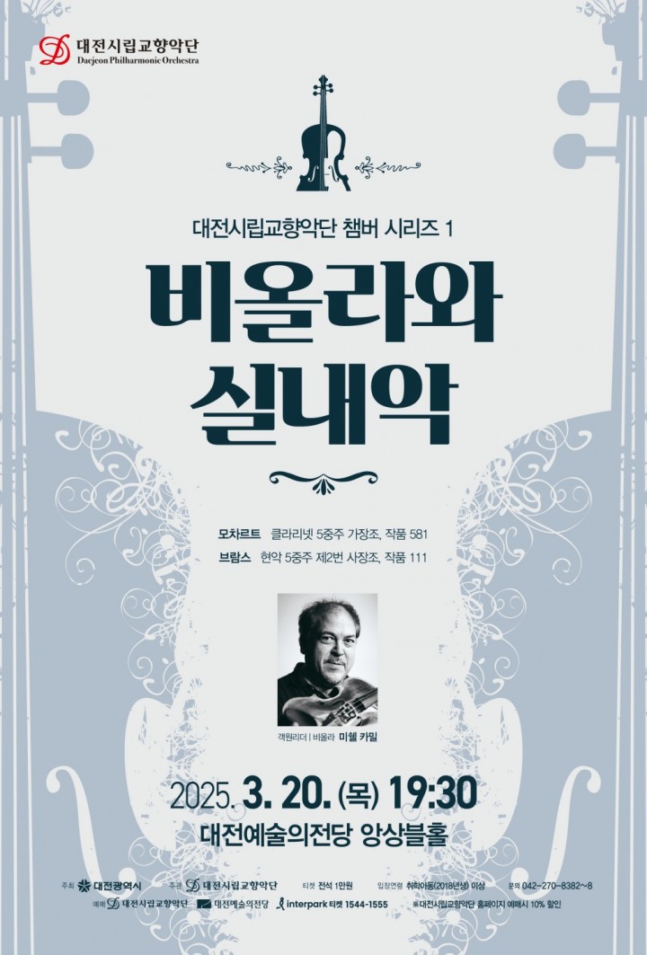 [대전타임뉴스=홍대인 기자] 대전시립교향악단이 오는 3월 20일(목) 저녁 7시 30분, 대전예술의전당 앙상블 홀에서 ‘챔버 시리즈 1: 비올라와 실내악’을 선보인다. 대전시립교향악단의 챔버 시리즈는 매년 세계적인 연주자를 객원 리더로 초청해 수준 높은 프로그램과 깊이 있는 연주를 선사하며, 실내악 애호가들의 꾸준한 사랑을 받아왔다. 올해 첫 번째 시리즈에서는 덴마크를 대표하는 ‘에스비에르 앙상블’의 예술감독을 역임한 비올리스트 미쉘 카밀이 객원 리더로 나선다. BBC 심포니 오케스트라의 비올라 수석 출신인 그는 실내악 연주자로서 세계 무대에서 활약하며, 교육자로서도 왕성한 활동을 이어가고 있다. 이번 무대의 첫 곡은 모차르트의 ‘클라리넷 5중주, 작품 581’로, 클라리넷과 현악기의 조화로운 앙상블이 돋보이는 명곡이다. 이어 브람스의 ‘현악 5중주 제2번 사장조, 작품 111’이 연주되며, 비올라의 깊고 따뜻한 음색이 극대화될 예정이다. 공연 티켓은 전석 1만 원이며, 예매는 공연 전일 오후 5시까지 대전시립교향악단 및 대전예술의전당 홈페이지, 인터파크에서 가능하다. 자세한 사항은 대전시립교향악단 홈페이지 또는 전화(☎042-270-8382~8)로 문의하면 된다.