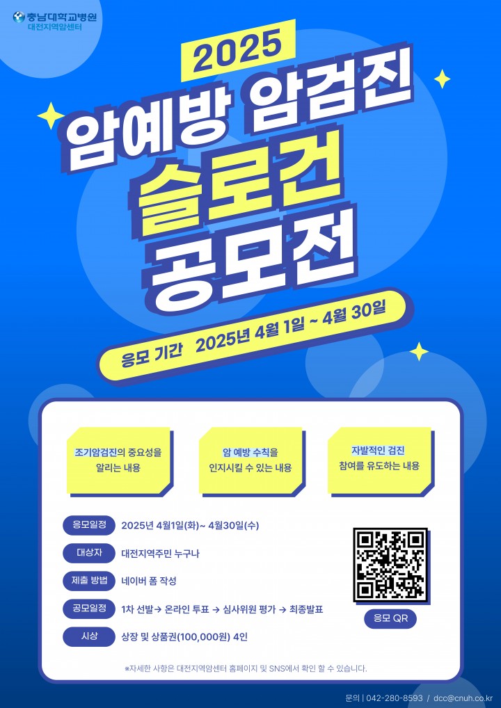 [대전타임뉴스=홍대인 기자] 충남대학교병원 대전지역암센터(소장 이상일 위장관외과 교수)는 4월 1일부터 4월 30일까지 한 달간 지역주민을 대상으로 '암예방·암검진 슬로건 공모전'을 진행한다. 이번 공모전은 조기 암검진의 중요성, 암 예방 수칙에 대한 인식 제고, 그리고 자발적인 암검진 참여를 유도하기 위한 것으로, 지역주민들이 공감할 수 있는 창의적인 슬로건을 모집한다. 대전지역 주민이라면 누구나 응모할 수 있으며, 포스터에 삽입된 QR코드 또는 대전지역암센터 홈페이지 내 슬로건 공모전 게시글을 통해 참여 가능하다. 공모는 1차 내부 심사를 통해 선정된 작품들을 대상으로 온라인 투표를 진행한 뒤, 상위 득표작들에 대해 전문가 심사를 거쳐 최종 수상작 4편을 선정하게 된다. 수상자에게는 시상 및 포상이 주어지며, 자세한 사항은 대전지역암센터 홈페이지 공지사항을 통해 확인할 수 있다. 공모전 결과는 5월 중 발표되며, 대전지역암센터 공식 홈페이지 및 SNS 채널을 통해 공개된다. 선정된 슬로건은 2025년 암예방 및 암검진 홍보 캠페인에 적극 활용될 예정이다. 이상일 대전지역암센터 소장은 "이번 공모전이 지역사회에 암 예방의 중요성과 건강정보를 널리 알릴 수 있는 계기가 되기를 기대한다"고 말했다.