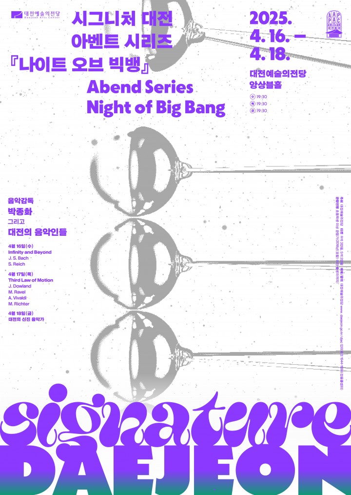 [대전타임뉴스=홍대인 기자] 대전예술의전당(관장 김덕규)이 지역 예술가들과 함께하는 예술 축제 ‘2025 시그니처 대전’의 막을 올린다. 기존 ‘스프링 페스티벌’에서 명칭을 바꾼 ‘시그니처 대전’은 단순한 지역 축제를 넘어, 지역성과 보편성을 아우르는 새로운 방향성을 지향한다. 지역 예술인의 무대 기회를 넓히고 시민들과의 접점을 강화하고자 올해부터 새롭게 출범했다. 올해 첫 행사로는 ‘아벤트 시리즈’가 4월 16일부터 18일까지 3일간 대전예술의전당에서 개최된다. 이번 시리즈의 음악감독은 피아니스트 박종화가 맡았다. ‘Big Bang(빅뱅)’이라는 주제로 펼쳐질 이번 공연은 움직임과 음악이 결합해 새로운 소리의 세계를 선보인다. 오디션을 통해 선발된 9명의 청년 예술인을 포함, 총 40여 명의 지역 청년 예술가들이 무대에 오른다. 프로그램은 △4월 16일 ‘Beyond Infinity(가속하는 나선과 멈추지 않는 맥박)’ △4월 17일 ‘Third Law of Motion(측정된 스윙과 운동의 취약성)’ △4월 18일 ‘New Horizon(신진예술가-새로운 지평)’ 등 3부작으로 구성되며, 음악의 확장성과 연속성을 주제로 한 다양한 퍼포먼스를 선보일 예정이다. 박종화 음악감독은 “이번 페스티벌은 단순한 클래식 공연을 넘어 기계와 음악, 물리학과 지각의 경계가 허물어지는 장이 될 것"이라며, “움직임과 음악, 시간의 무질서한 본성이 충돌하는 역동적인 무대를 기대해 달라"고 말했다. 관람료는 R석 3만 원, S석 2만 원이며, 자세한 내용은 대전예술의전당 홈페이지(www.daejeon.go.kr/djac)를 통해 확인하거나 042-270-8333으로 문의하면 된다.