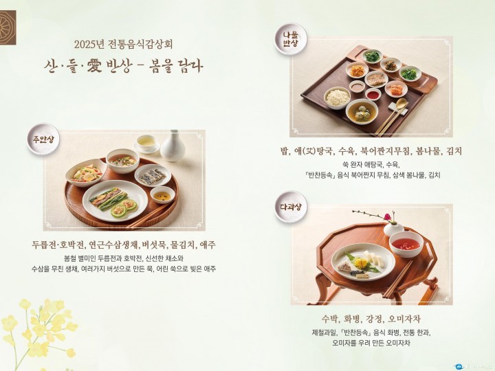 [청주타임뉴스=한정순 기자] 청주시는 초정행궁과 청주 고유의 전통음식을 널리 알리기 위해 오는 19일부터 다음 달 11일까지 ‘초정행궁 수라간 전통음식 감상회’를 운영한다. 이번 감상회는 청원구 내수읍에 위치한 초정행궁에서 매주 토요일과 일요일, 오전 11시 30분과 오후 1시 하루 2회씩 진행되며, 회당 12명씩 체험할 수 있다. 예약은 오는 15일부터 청주시 통합예약시스템을 통해 접수 가능하며, 참가비는 1인당 2만원이다. ‘산·들·愛(애) 반상, 봄을 담다’라는 주제로 열리는 이번 행사는 봄 제철 식재료와 청주지역 음식문화 기록유산인 반찬등속을 활용해 구성됐다. 참여자들은 전통음식에 대한 해설을 들으며 시식 체험을 함께할 수 있다. 총 3코스로 구성된 음식 감상회는 △봄철 별미 두릅전과 어린 쑥으로 빚은 애주를 곁들인 ‘주안상’ △쑥완자 애탕국, 수육, 북어짠지, 봄나물로 구성된 ‘반상’ △들깨강정, 화병, 오미자차로 구성된 ‘다과상’으로 진행된다. 청주시 관계자는 “세종대왕이 치유를 위해 방문했던 초정행궁의 역사성과 함께 청주의 전통음식문화를 현대적으로 재해석한 특별한 체험이 될 것"이라며 “많은 시민들의 관심과 참여를 바란다"고 했다. 한편, 반찬등속은 1913년 청주 상신리 진주강씨 가문의 며느리에 의해 고 한글체로 기록된 조리서로, 충북유형문화재 제381호로 지정돼 있다. 청주 양반가의 식문화를 비롯해 100여 년 전 지역의 생활상과 언어, 역사 등을 살필 수 있는 귀중한 자료로 평가받고 있다.