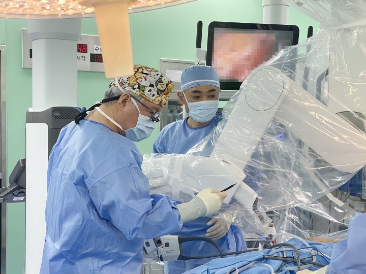 [대전타임뉴스=홍대인 기자] 건양대병원 외과 윤대성 교수가 대전·충청 지역 최초로 첨단 단일공 로봇수술기인 '다빈치 SP(Single Port)'를 이용해 양측 유두보존 유방절제술에 성공했다고 15일 밝혔다. 최근 40대 여성 A씨는 좌측 유방의 멍울이 촉지되어 개인병원에서 조직검사를 시행한 결과 왼쪽 유방암, 오른쪽 석회화 유방질환이 확인되어 건양대병원을 찾았다. 윤 교수 수술 전 검사를 통해 양측 유방 절제가 필요한 상태임을 확인하였고 일반적인 유방암 수술의 단점을 보완하기 위해 단일공 로봇 수술기인 다빈치 SP를 이용한 로봇수술을 결정하였다. 일반적인 유방암 수술은 유방암 조직은 물론 유두를 포함한 유방전체와 겨드랑이 임파선까지 직접 절제 하기 때문에 수술의 범위가 넓어져 정면으로 보면 흉터가 남아 환자들의 만족도가 낮다. 이에 반해 첨단 단일공 로봇수술기인 다빈치 SP를 이용한 로봇 양측 유두보존 유방절제술은 양쪽 겨드랑이 부근 3~5cm 정도의 절개만으로 유방암을 절제함과 액와 림프절 수술이 가능해, 기존의 유방암 수술보다 흉터가 작아 눈에 잘 띄지 않는 것은 물론이고, 유두와 유륜을 보존할 수 있으며, 환자의 빠른 회복과 만족도를 높일 수 있었다. 또한 권성욱, 배인의 교수팀이 유방절제술 후 조직확장기 삽입 과정 없이 절개 부위를 이용해 유방재건술도 동시에 이뤄져 환자의 만족도가 크게 상승됐다. 윤대성 교수는 “지금까지 축적해 온 로봇수술 기술과 노하우를 바탕으로, 한층 정교해진 단일공 로봇수술을 통해 유방암 치료에 성공할 수 있었다"면서 “앞으로도 로봇수술의 장점을 극대화해 환자의 빠른 회복과 심리적·미용적 만족을 높일 수 있도록 임상과 연구 분야에 더욱 힘쓸 것"이라고 전했다. 다빈치 SP는 하나의 절개창을 통해 수술하는 단일공 플랫폼으로, 절개부위가 적어 흉터를 최소화할 수 있으며, 좁은 공간에서도 로봇팔이 자유롭게 움직일 수 있어 수술 효율이 높다. 또 수술 기구와 카메라가 하나의 관에서 나오지만 모든 수술 기구와 카메라에 관절이 있어 서로 충돌이 발생하지 않고, 보다 세밀한 병변 접근이 가능한 것으로 알려져 있다.