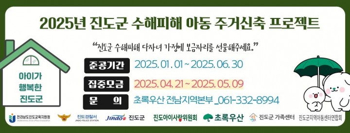 해당 가정은 조모와 부모, 세 자녀 등 총 6인으로 구성된 기초수급 가구로 지난해 7월과 9월, 진도군에 내린 역대급 집중호우로 두 차례나 침수 피해를 입었다.이들이 거주하던 집은 무허가 건축물로 기초공사 부실로 인해 바닥이 내려앉는 등 구조적인 문제가 발생했고, 집중호우 당시 집 앞 도로 보다 낮은 지형으로 인해 빗물이 집 안으로 그대로 유입됐다.이로 인해 가전제품과 생필품이 모두 침수되고, 현재는 곰팡이와 바닥 붕괴 우려로 마을회관에서 임시 생활 중인 상황이다.초록우산 어린이재단에 따르면, 기존 무허가 건축물 옆에 위치한 같은 가정 소유의 농지에 새 보금자리의 건축이 가능한 것으로 확인됐으며, 현재 해당 부지를 활용한 신축 주택 공사가 진행 중이다.김유성 초록우산 전남지역본부장은 “지방 소멸과 인구 감소, 저출생 문제에 대응하기 위해서는 아이들이 건강한 환경에서 성장할 수 있도록 돕는 것이 무엇보다 중요하다"며 “위기 아동 가정을 위한 지역사회의 관심과 지원이 절실하다"고 전했다.