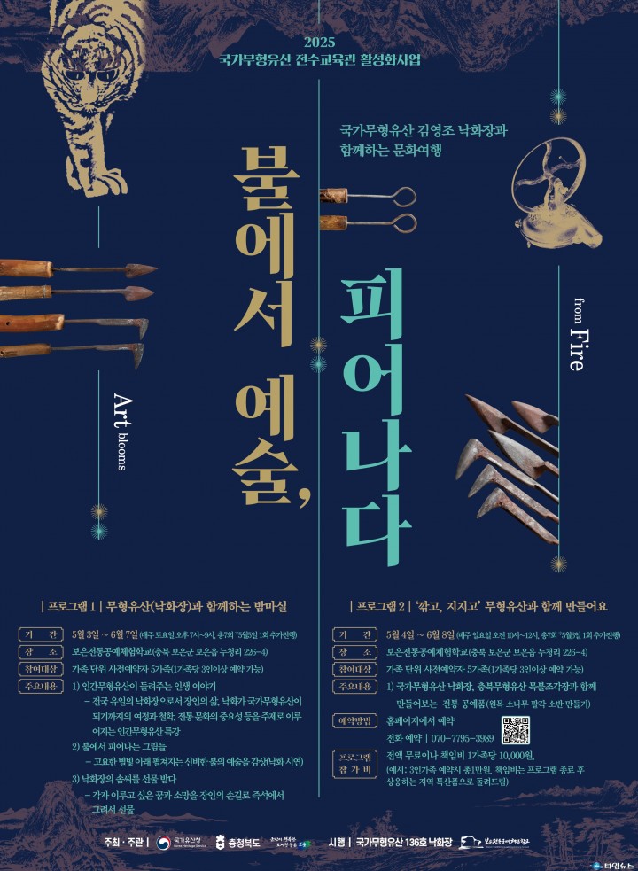 이번 프로그램은 ‘김영조 낙화장과 함께하는 문화여행 – 불에서 예술, 피어나다’라는 주제로 진행되며, 낙화장 전통을 경험하고 그 가치를 알리는 목적을 가지고 있다. 프로그램은 낙화장의 예술적 아름다움을 체험하고, 충북 무형유산인 목불조각장과 협업하여 다양한 전통문화를 접할 수 있는 기회를 제공할 예정이다.