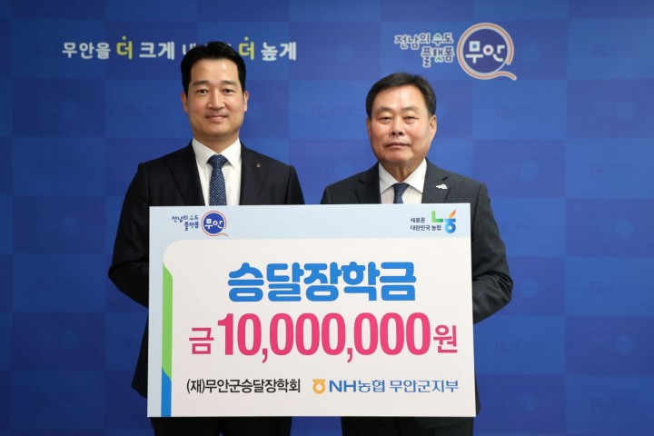 [무안타임뉴스] 오현미 기자 = 전남 무안군은 25일 NH농협은행 무안군지부에서 지역인재 육성을 위해 써달라며 1000만 원을 승달작학금에 기탁했다고 밝혔다.이번 기탁은 김산 군수와 박성덕 NH농협은행 무안군지부장을 비롯해 임직원이 참석한 가운데 뜻깊은 행사가 진행됐으며, 기탁된 장학금은 지역의 인재들이 꿈을 이루는 데 도움을 줄 예정이다.NH농협은행 무안군지부는 지난 2020년 무안군 승달장학회에 1000만 원 기탁 등 지금까지 3000만 원을 기탁했다. 무안군-농협 제휴카드로 발생한 적립포인트를 기금으로 전달하고 취약계층을 위한 쌀과 학용품을 기탁하는 등 다양한 지역사회공헌 활동을 펼치고 있다.박성덕 지부장은 “이번 장학금이 지역 학생들이 인재로 성장하는 밑거름이 되길 바란다"며 “앞으로도 지역사회와 상생을 위해 무안군과 적극 협력하고 침체한 지역경기 활성화에도 보탬이 되겠다"고 전했다.김산 군수는 “지역인재 양성과 소외계층을 위한 꾸준한 기탁활동에 감사드린다"며, “이번 장학금은 지역 학생들의 꿈을 응원하고 학생들이 지역사회에 다시 환원할 수 있는 인재로 성장하도록 소중히 사용하겠다"고 말했다.