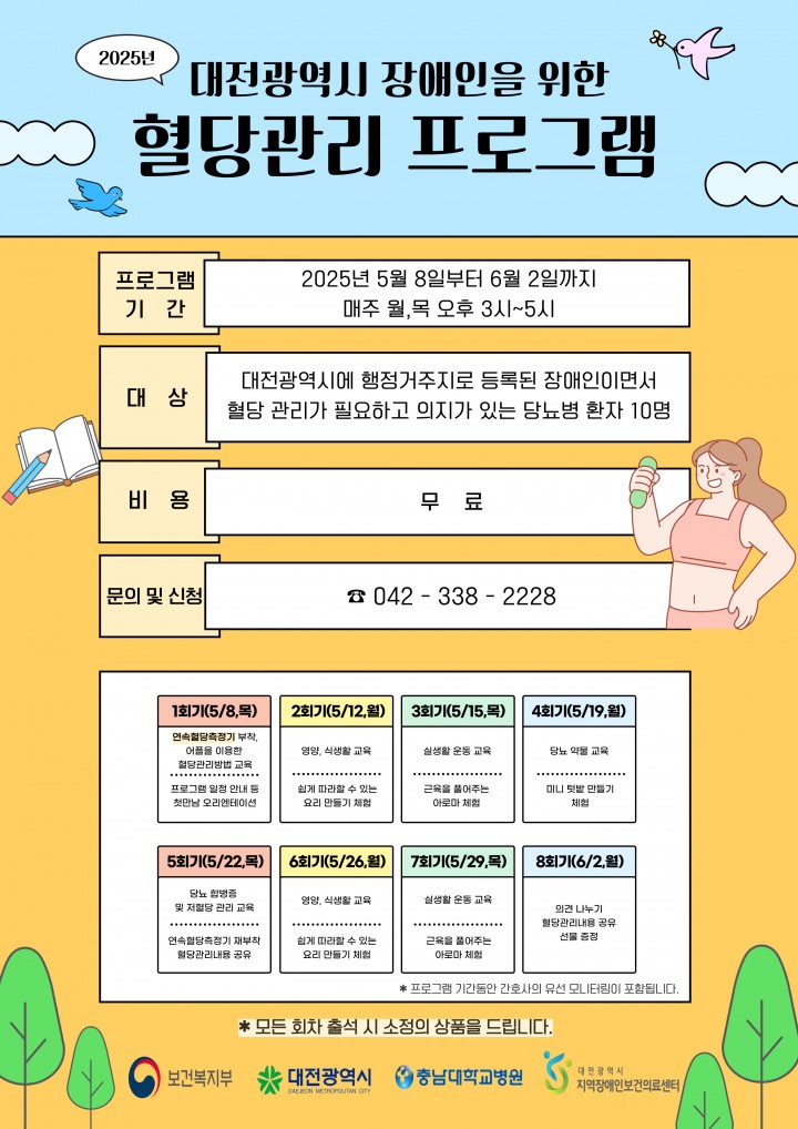[대전타임뉴스=홍대인 기자] 충남대학교병원이 위탁 운영하는 대전광역시 지역장애인보건의료센터(센터장 복수경, 재활의학과 교수)는 오는 5월 8일부터 6월 2일까지 지역 장애인을 대상으로 '2025년 지역장애인을 위한 혈당관리 프로그램'을 실시한다고 밝혔다. 이번 프로그램은 대전시에 행정 거주지를 둔 장애인 중 혈당 관리가 필요한 당뇨병 환자 10명을 선정해 충남대학교병원 대전충청권역 의료재활센터 세미나실에서 주 2회, 총 8회에 걸쳐 운영된다. 참여자는 프로그램 기간 동안 △연속혈당측정기 부착 △식생활 및 영양 교육 △운동 교육 △당뇨 합병증 및 저혈당 예방 교육 △인슐린 포함 약물 교육 △관련 체험 활동 △담당 간호사의 지속 건강 모니터링 및 상담 등의 다양한 지원을 받게 된다. 복수경 센터장은 "연속혈당측정기를 통해 혈당 변화를 쉽게 파악하고, 다양한 교육과 지속적인 모니터링을 통해 장애인 개인별 맞춤형 건강관리를 지원할 것"이라며 "이번 프로그램이 지역 장애인의 당뇨병 예방과 건강한 삶을 돕는 계기가 되길 바란다"고 말했다. 한편, 대전광역시 지역장애인보건의료센터는 2018년 5월 보건복지부 공모를 통해 설립된 이후 장애인 건강보건관리, 여성장애인 모성보건, 보건의료인력 및 가족 교육, 건강검진·진료·재활 의료서비스 제공 등 다양한 사업을 추진해오고 있다.