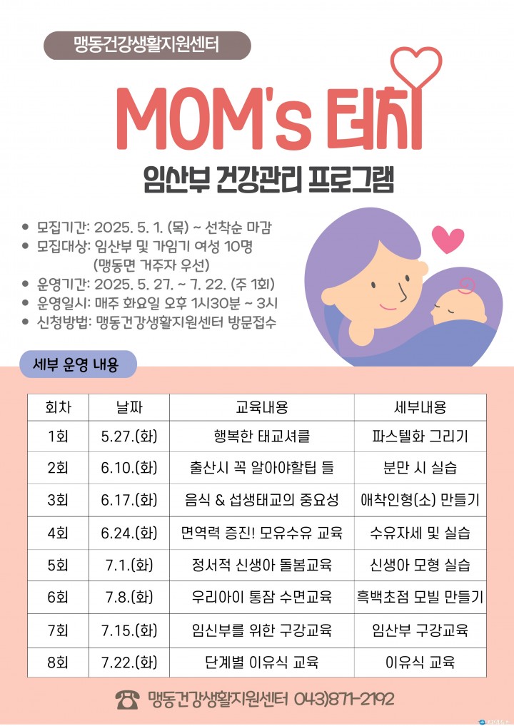【음성타임뉴스=한정순 기자】 음성군 맹동건강생활지원센터는 임산부의 건강한 출산과 육아 준비를 돕기 위한 임산부 건강관리 프로그램 ‘MOM’s 터치’를 오는 5월 27일부터 운영한다고 밝혔다.