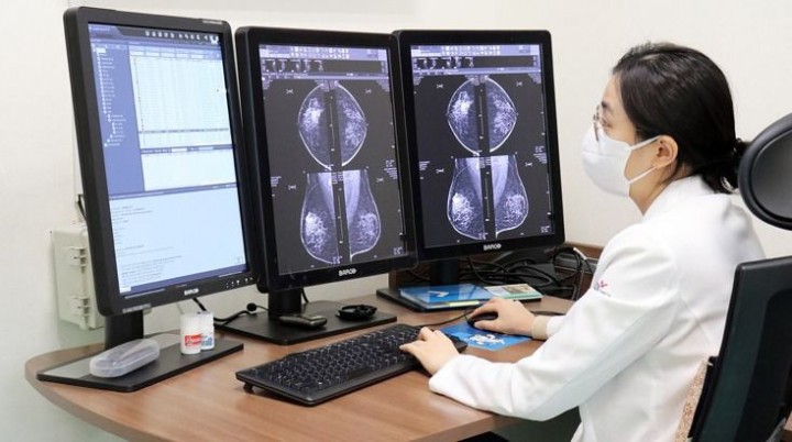 ▲한국건강관리협회 의료진이 유방암 진단AI솔루션을 활용해 영상판독을 하는 모습.(사진제공=한국건강관리협회 광주전남지부)