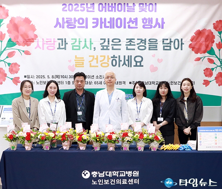 [대전타임뉴스=홍대인 기자] 충남대학교병원(병원장 조강희) 대전지역 노인보건의료센터(센터장 김준형, 심장내과 교수)는 제53회 어버이날을 맞아 8일, 센터 1층에서 내원한 어르신들에게 카네이션을 전달하는 '사랑의 카네이션' 행사를 열었다. 이 행사는 2010년 개원 이래 매년 어버이날마다 꾸준히 이어온 전통으로, 병원을 찾은 고령의 환자들에게 존경과 감사의 뜻을 전하기 위한 취지로 마련됐다. 이날 행사에 참여한 병원 관계자들은 손수 준비한 카네이션 꽃바구니를 어르신들에게 전달하며 따뜻한 인사를 나눴다. 카네이션을 받은 한 어르신은 "자녀가 외지에 있어 혼자 보내야 하는 날이었는데, 병원에서 이렇게 따뜻한 마음을 전해줘 큰 위로가 됐다"며 밝은 미소를 보였다. 김준형 센터장은 "작은 꽃 한 송이지만 어르신들께 행복을 드릴 수 있다면 그보다 큰 보람은 없다"며 "앞으로도 어르신들을 위한 공공의료기관으로서의 역할을 충실히 수행해나가겠다"고 밝혔다. 한편, 충남대학교병원 대전지역 노인보건의료센터는 2010년 4월 개원하여 심장, 뇌졸중, 노인정신건강, 재활 등 노인성 질환에 특화된 클리닉을 운영하고 있으며, 환자 중심의 통합 의료서비스를 제공해 지역 노인 보건의료의 중추적 역할을 하고 있다.