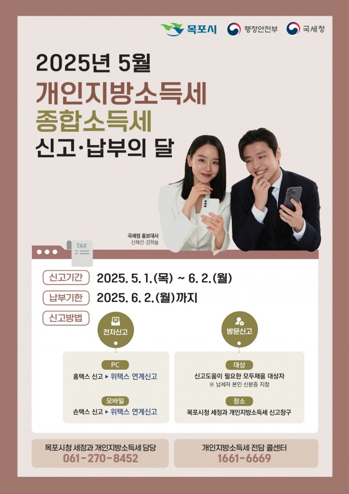 [목포타임뉴스] 오현미 기자 = 전남 목포시는 5월 한 달간 2024년 귀속 종합소득이 있는 시민을 대상으로 개인지방소득세 종합소득분 신고창구를 운영하며, 6월 2일까지 신고·납부해야 한다.