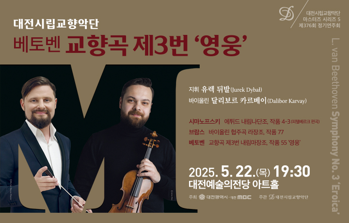 [대전타임뉴스=홍대인 기자] 대전시립교향악단이 오는 5월 22일(목) 오후 7시 30분, 대전예술의전당 아트홀에서 2025년 마스터즈 시리즈 다섯 번째 무대를 연다. 이번 연주는 베토벤 교향곡 제3번 '영웅'을 중심으로 구성되며, 세계적 명성의 지휘자와 협연자가 함께 무대에 올라 클래식 팬들의 기대를 모은다. 지휘는 폴란드 출신의 유렉 뒤발이 맡는다. 그는 신포니에타 크라코비아 시립오케스트라의 예술감독을 역임했으며, 현재는 폴란드 챔버 오케스트라 ROK의 상임지휘자로 활동 중이다. 유럽 음악계에서 해석력과 통찰을 동시에 인정받는 지휘자로 손꼽힌다. 협연자로는 빈 심포니 오케스트라의 악장이자 빈 음악예술대학 교수인 바이올리니스트 달리보르 카르베이가 무대에 선다. 그는 이번 공연에서 브람스의 '바이올린 협주곡 라장조'를 연주하며, 섬세한 테크닉과 깊은 감정 표현으로 낭만주의 협주곡의 진면목을 선보일 예정이다. 공연의 서막은 시마노프스키의 '에튀드 내림 나단조'로 시작된다. 원래 피아노를 위한 작품이었으나, 피텔베르크의 편곡을 통해 오케스트라로 새롭게 해석되어 서정성과 색채감이 돋보이는 작품으로 탄생했다. 후반부의 하이라이트는 단연 베토벤의 교향곡 제3번 '영웅'이다. 이 곡은 1803년 작곡되어 교향곡의 패러다임을 바꾼 기념비적 작품으로 평가받는다. 원래는 나폴레옹에게 헌정할 계획이었으나, 그의 황제 즉위에 실망한 베토벤은 이를 철회하고, 이상적 영웅에게 곡을 헌정했다. 200년이 넘도록 사랑받아온 이 작품은 이날 공연의 감동을 절정으로 끌어올릴 것으로 보인다. 예매는 공연 전날인 5월 21일 오후 5시까지 대전시립교향악단과 대전예술의전당 홈페이지, NOL티켓을 통해 가능하다. 자세한 문의는 대전시향(☎042-270-8382~8)으로 하면 된다.